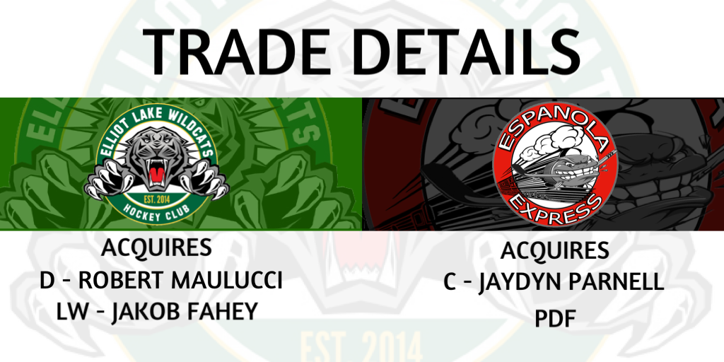 The Elliot Lake Wildcats have traded forward Jaydyn Parnell and a PDF to the Espanola Express in exchange for defenceman Robert Maulucci and left winger Jakob Fahey. Parnell, an 18-year-old from Milton, ON collected 8 goals and 10 assist in 80 games with the Wildcats. Maulucci, an 18-year-old from Buffalo, NY, USA collected 3 goals […]