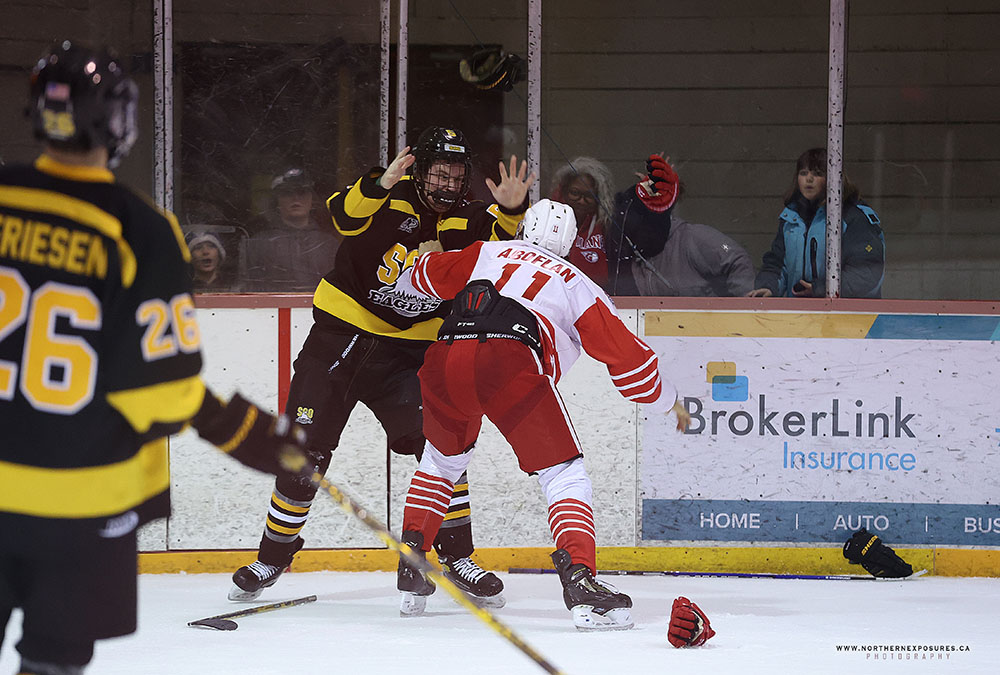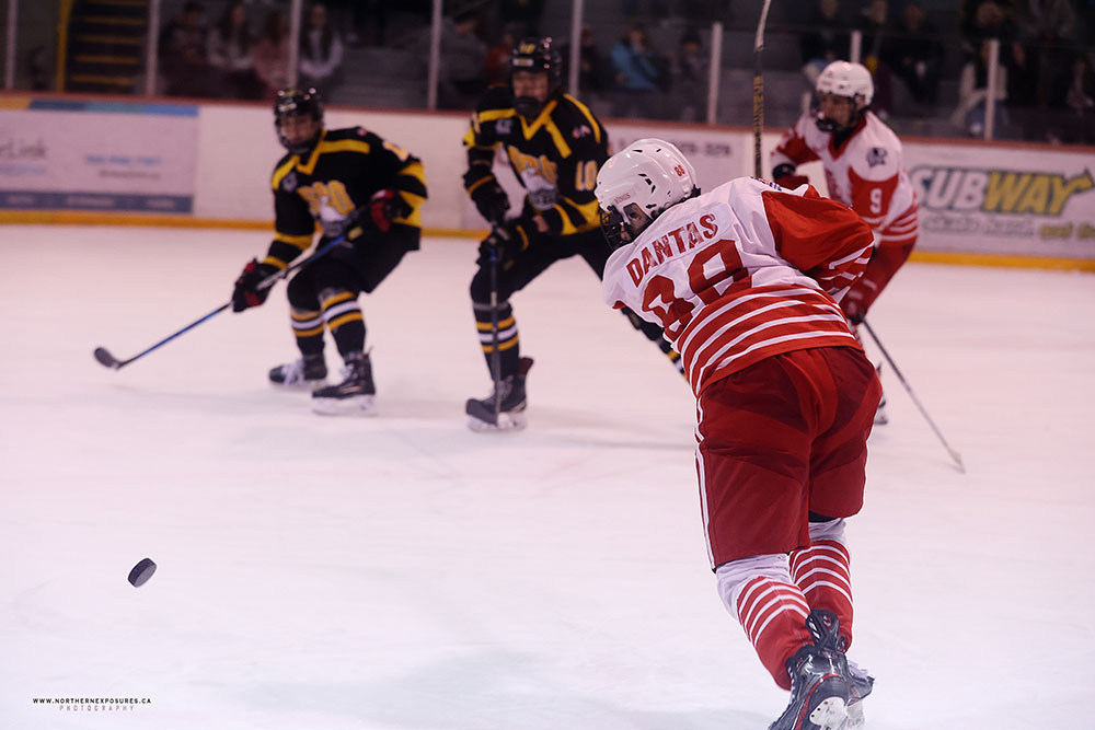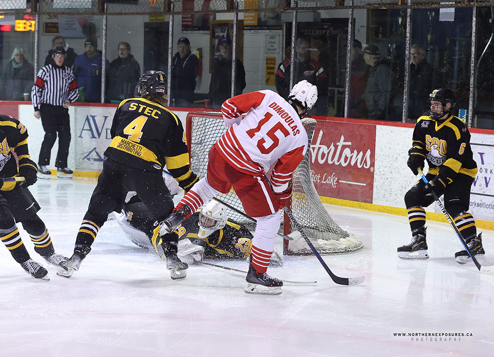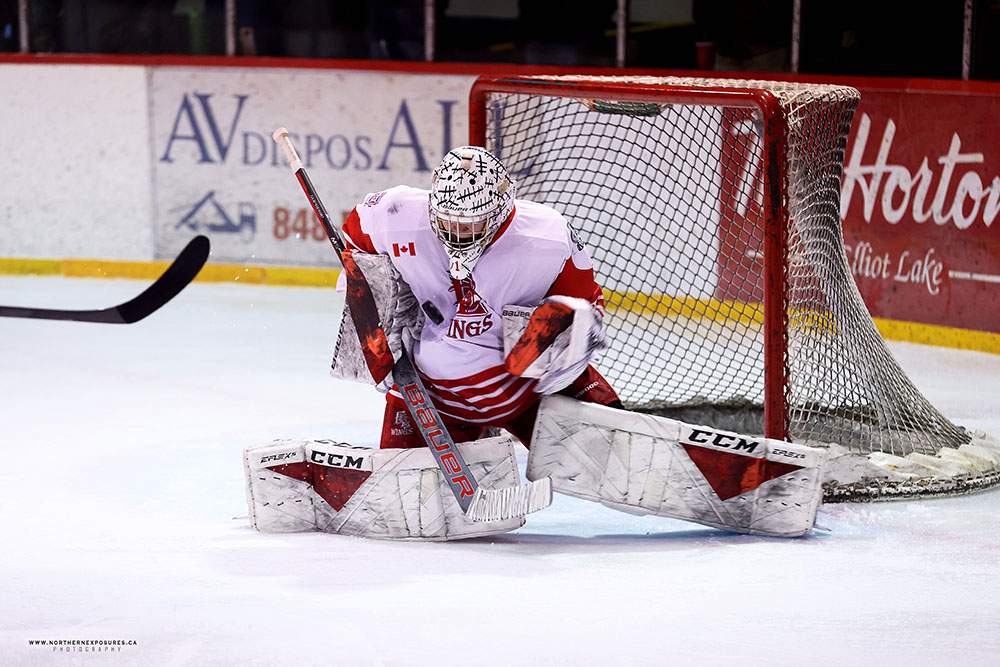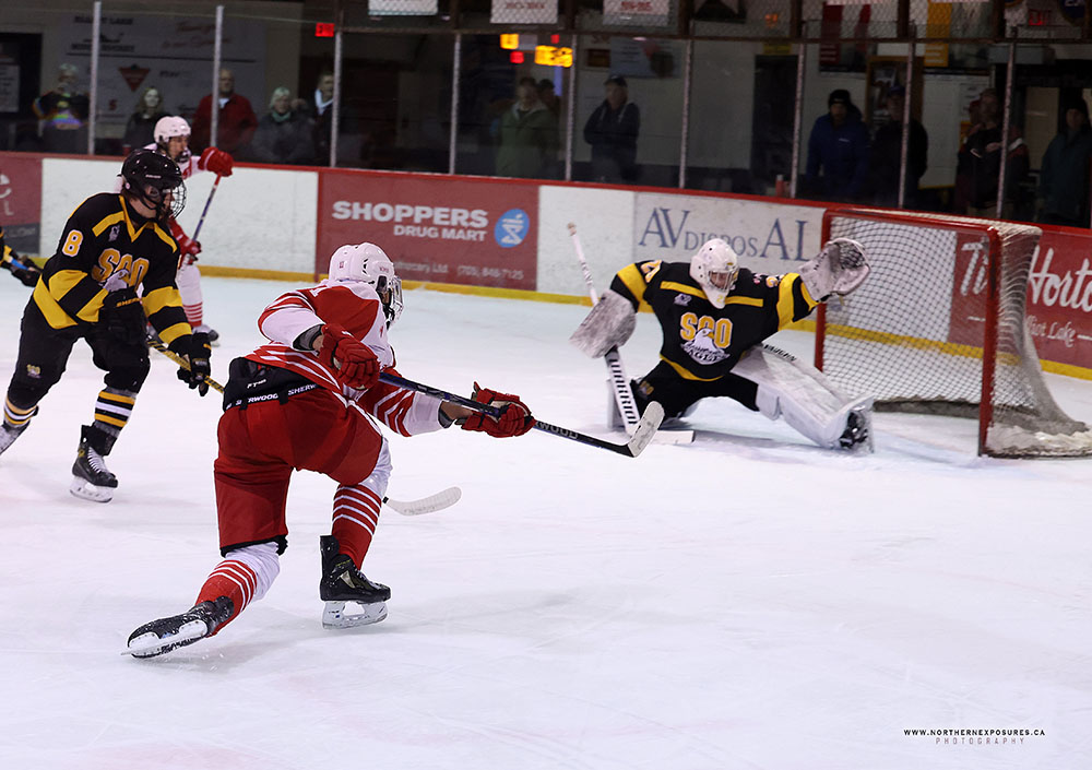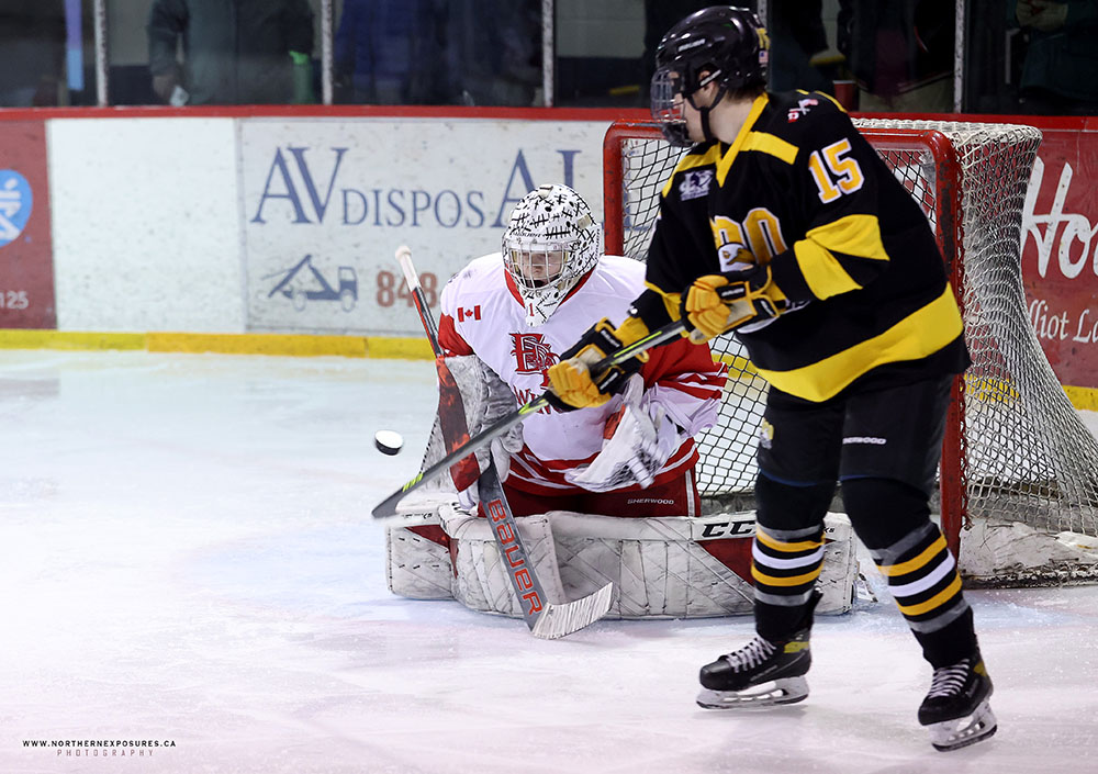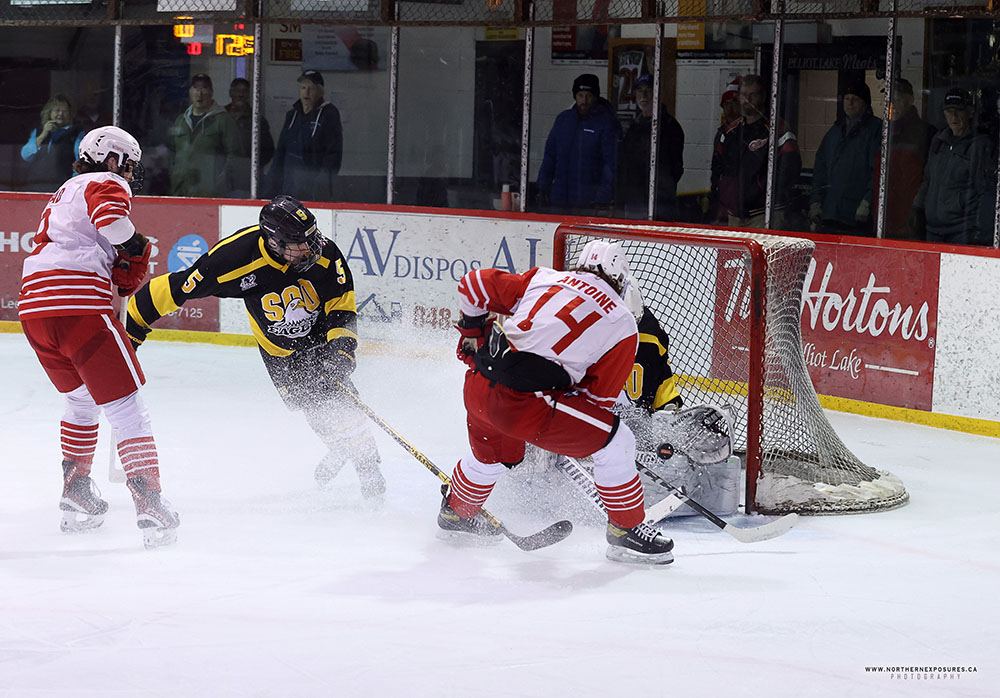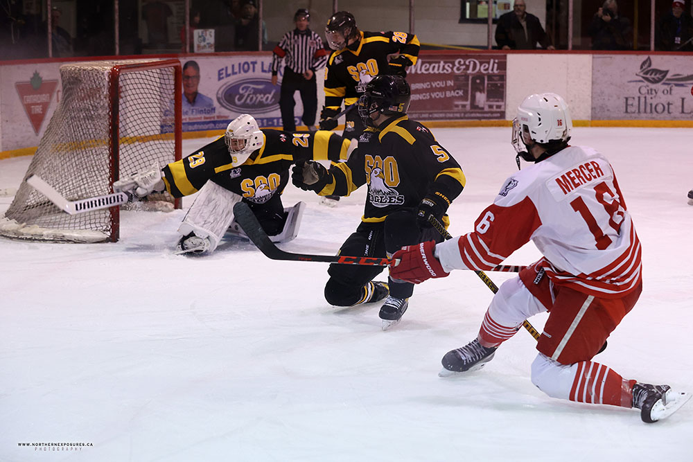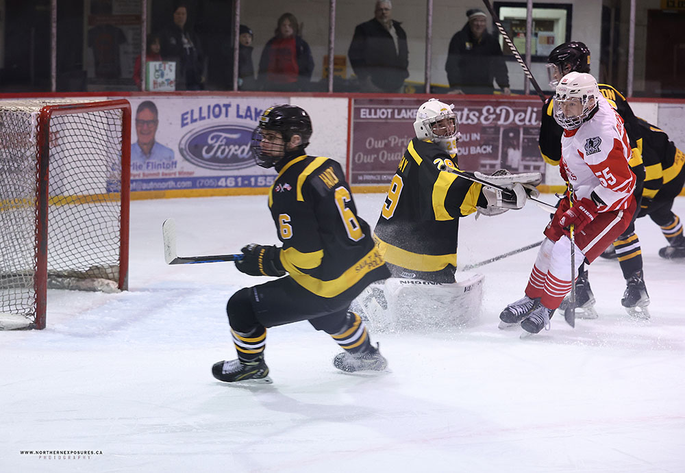 Sault Ste. Marie benefitted from a costly giveaway by an Elliot Lake defender as his clearing attempt went right to the Soo’s Teig Driessen in the slot then saw him move in a put one under the pad to Red Wings’ netminder Sean Guerin, nearly 16 minutes into the proceedings.