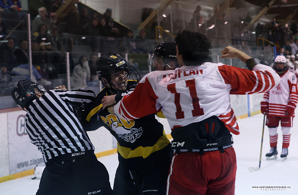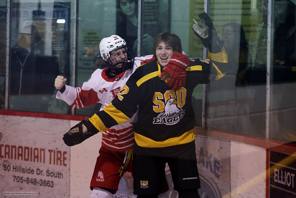 ELLIOT LAKE, Ont. – Storming back from an early deficit, the Elliot Lake Red Wings countered with five unanswered markers to pull out a 5-2 come from behind triumph over the Soo Egles Saturday in a Northern Ontario Junior Hockey League match-up at Centennial Arena.