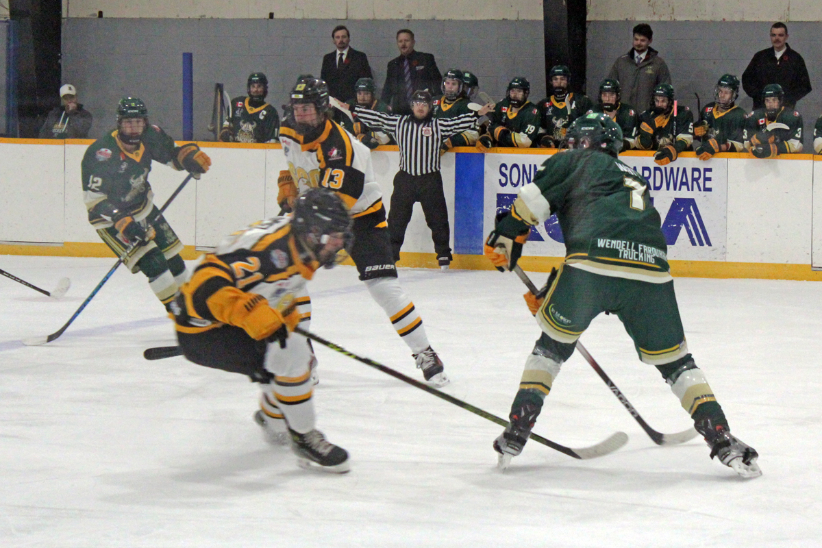 MASSEY, Ont. – Backed by a multi-point night by Copper Fredericks, the Soo Eagles skated to a 4-1 victory over the Elliot Lake Vikings Friday in a Northern Ontario Junior Hockey League get together held at Massey & District Community Arena.