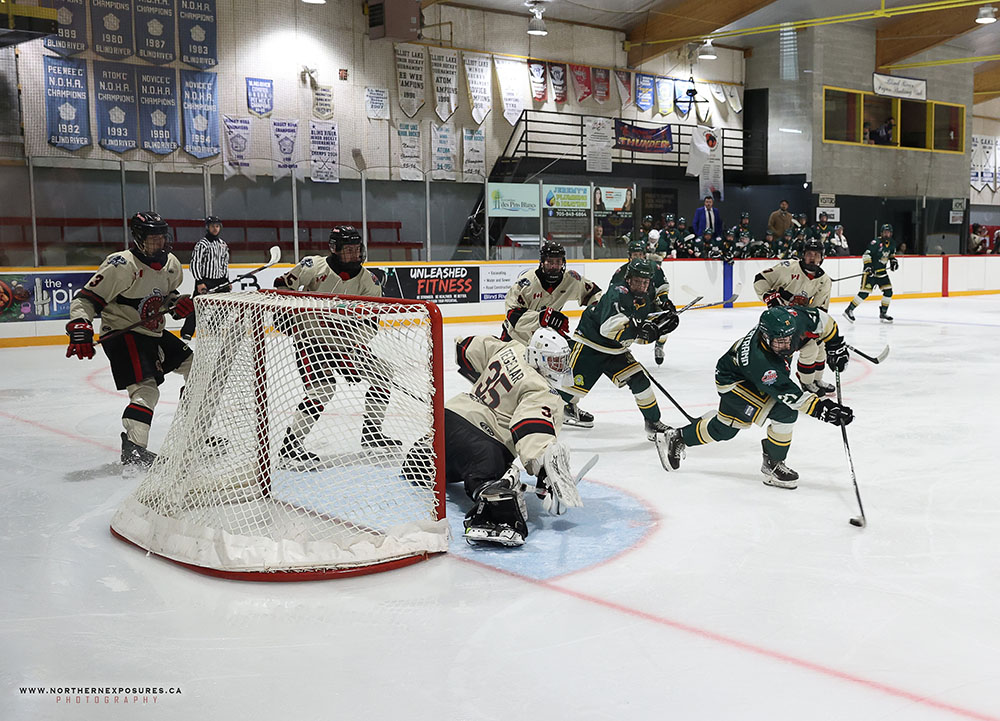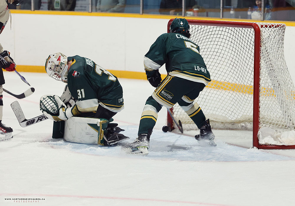 Coming back to tie it at 3:52, Elliot Lake drew level in similar fashion when Carter Carriere pressured a turnover in mid-ice, which helped Noah Aboflan skate in and put a pass across on the tape of Nathan Marincola, who pumped a top shelf shot past Blind River starter Noah Tegelaar.