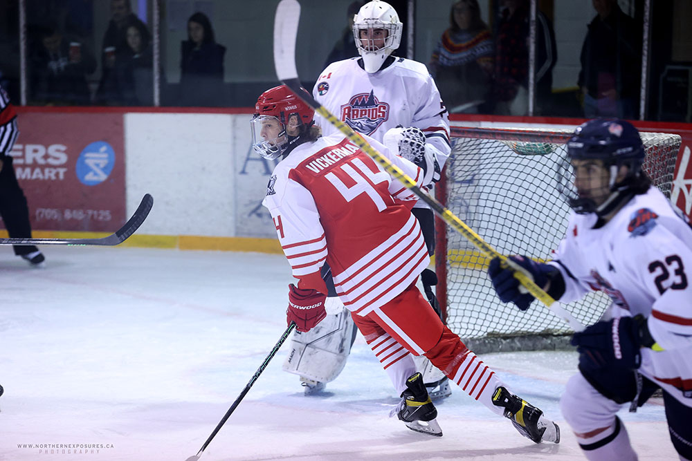 Notching the night’s opening tally with just over six minutes remaining in the first period, the home side converted when Charlie Wesholowski put a backhand out from behind the net into the slot where Braden Twigg snapped in a one-timer low on French River starter Kaleb Papineau.